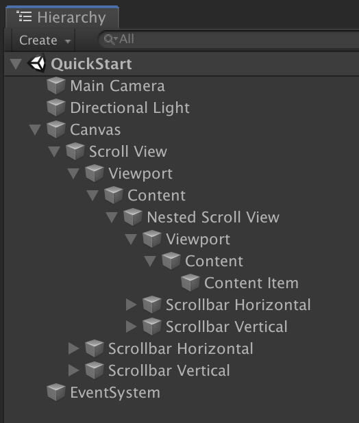 To create a Nested Scroll View in the Unity Editor, go to GameObject → UI → Nested Scroll View. Put it under the Scroll View container.