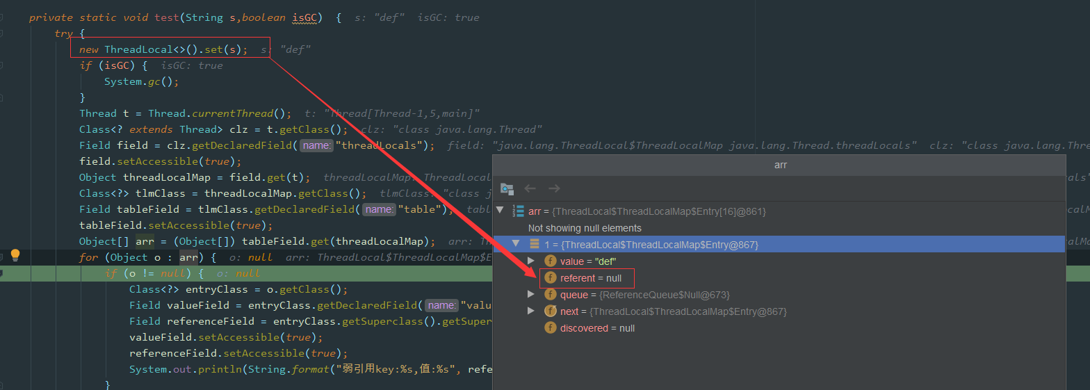 弱引用key:null,值:def如图所示,因为这里创建的ThreadLocal并没有指向任何值,也就是没有任何引用: