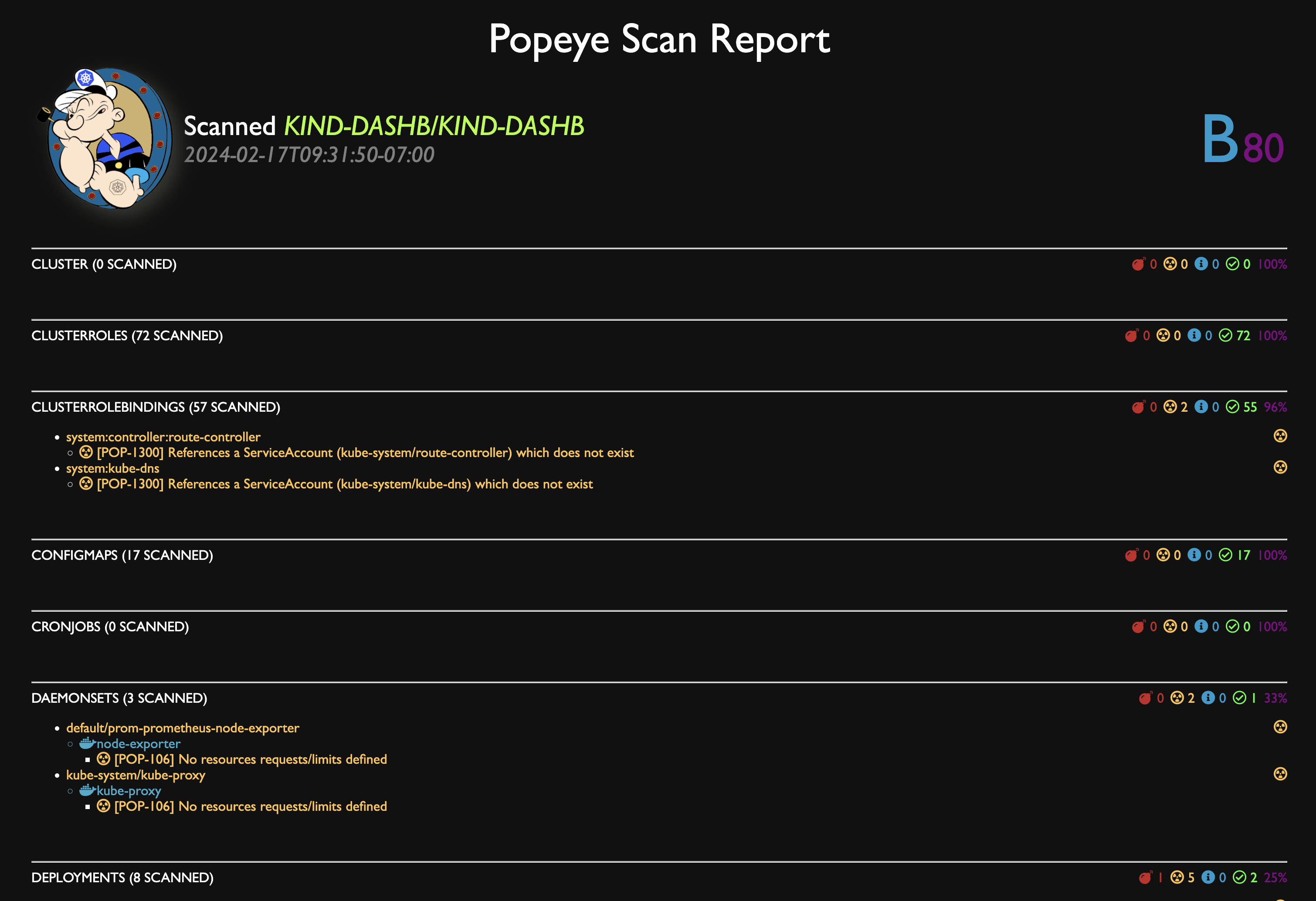 popeye helpPopeye scans your cluster for best practices and potential issues. Currently, Popeye only looks for a given set of curated Kubernetes resources. More will come soon! We are hoping Kubernetes friends will pitch'in to make Popeye even better.