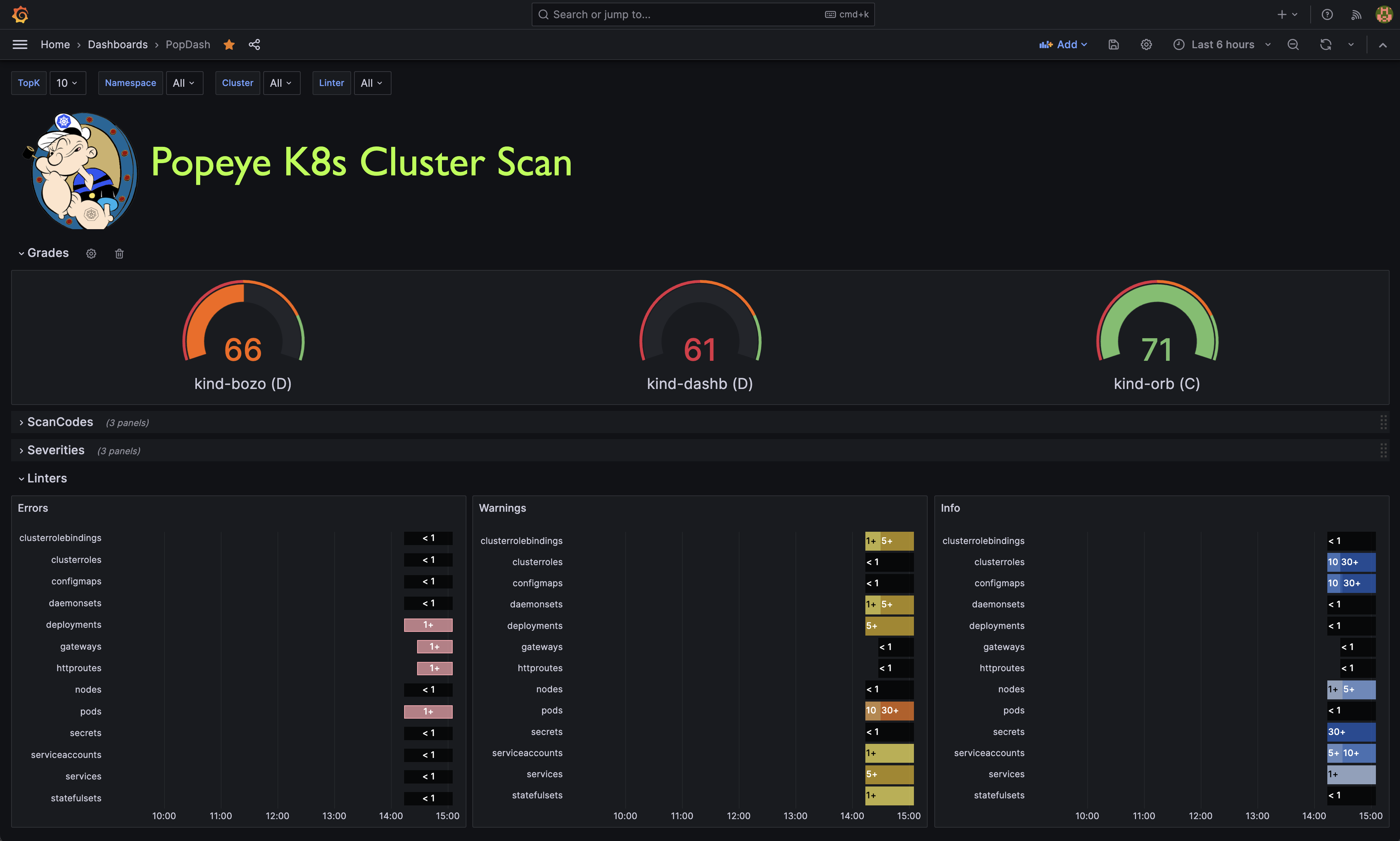 Popeye publishes Prometheus metrics. We provided a sample Popeye dashboard to get you started in this repo.