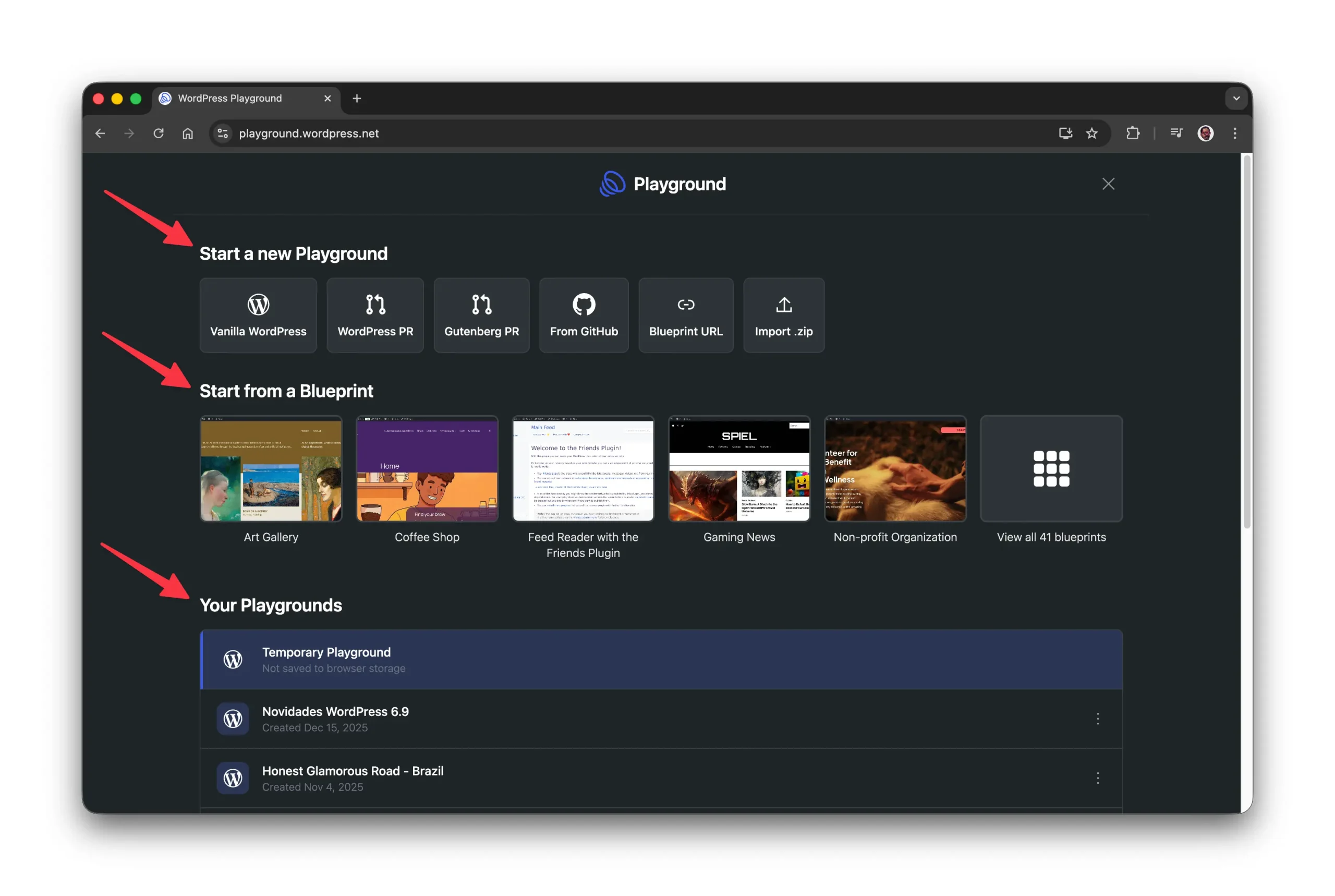 Saved playgrounds moved from the settings panel to a dedicated dashboard with its own landing page at playground.wordpress.net.
