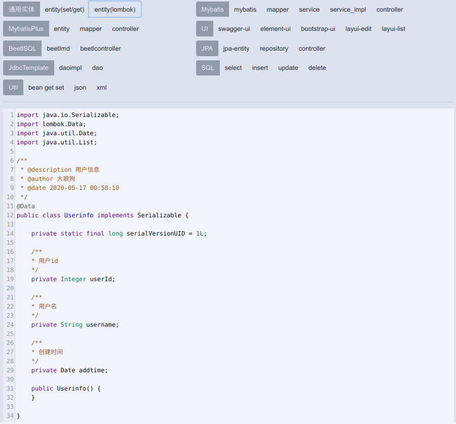 | 20191115 | 1.添加tinyint类型转换(感谢@lixiliang&@liujiansgit的Suggestion). 2.添加一键复制功能(感谢@gaohanghang的Suggestion). 3.Mybatis的insert增加keyProperty="id"用于返回自增id(感谢@88888888888888888888的Suggestion). 4.优化date类型的支持(感谢@SteveLsf的反馈). 5.其他一些优化. |