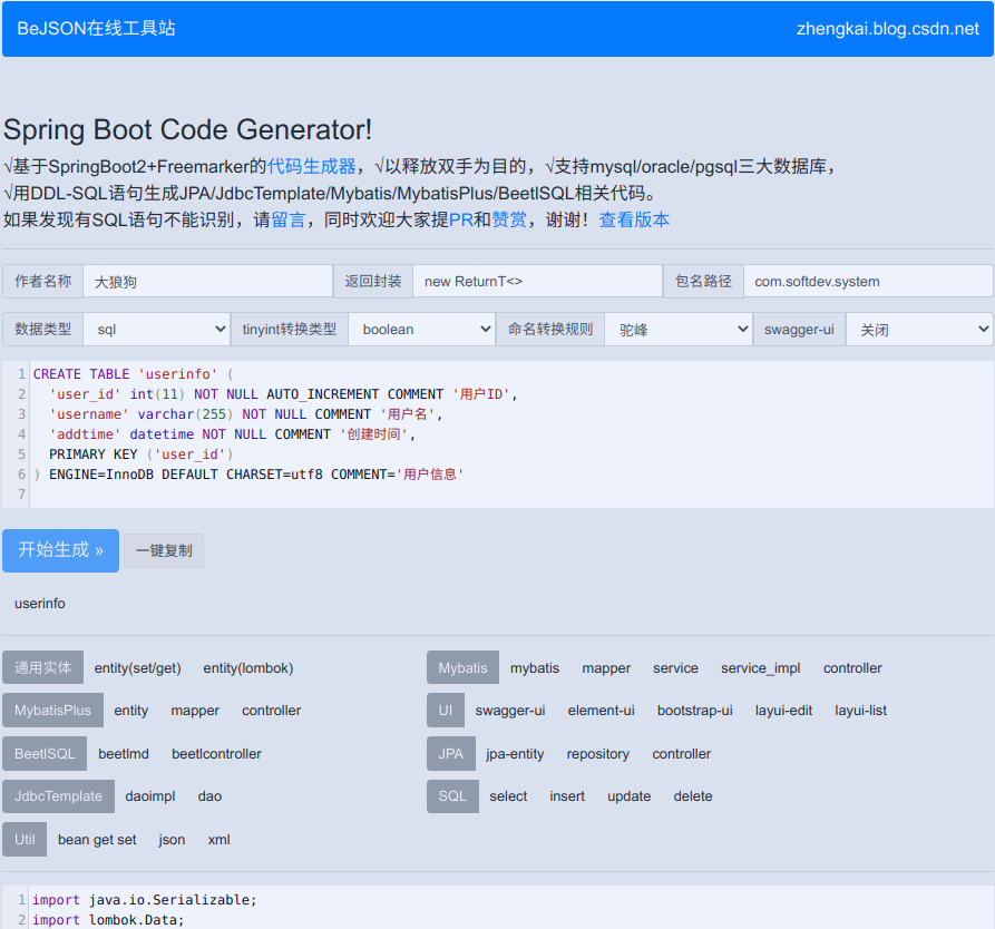 √基于SpringBoot2+Freemarker的代码生成器,√以释放双手为目的,√支持mysql/oracle/pgsql三大数据库, √用DDL-SQL语句生成JPA/JdbcTemplate/Mybatis/MybatisPlus/BeetlSQL相关代码.