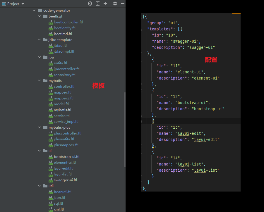 可通过建表SQL语句INSERT语句或者简单JSON生成预设的JPA/JdbcTemplate/Mybatis/MybatisPlus/BeetlSQL/CommonMapper相关模板代码.