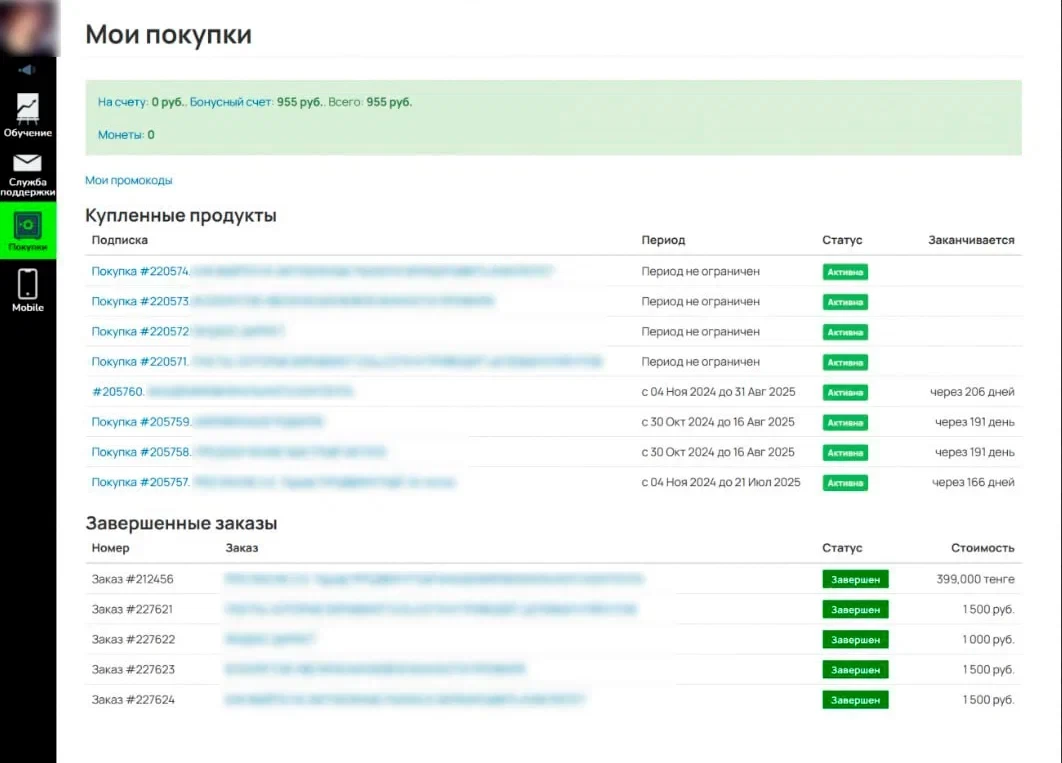 2. Скриншоты из личного кабинета на платформе, где проходило обучение (например, Геткурс, Антитренинги, личная платформа школы). На скриншоте должны быть видны ваше имя, почта или номер телефона, а также курс, который вы приобрели.