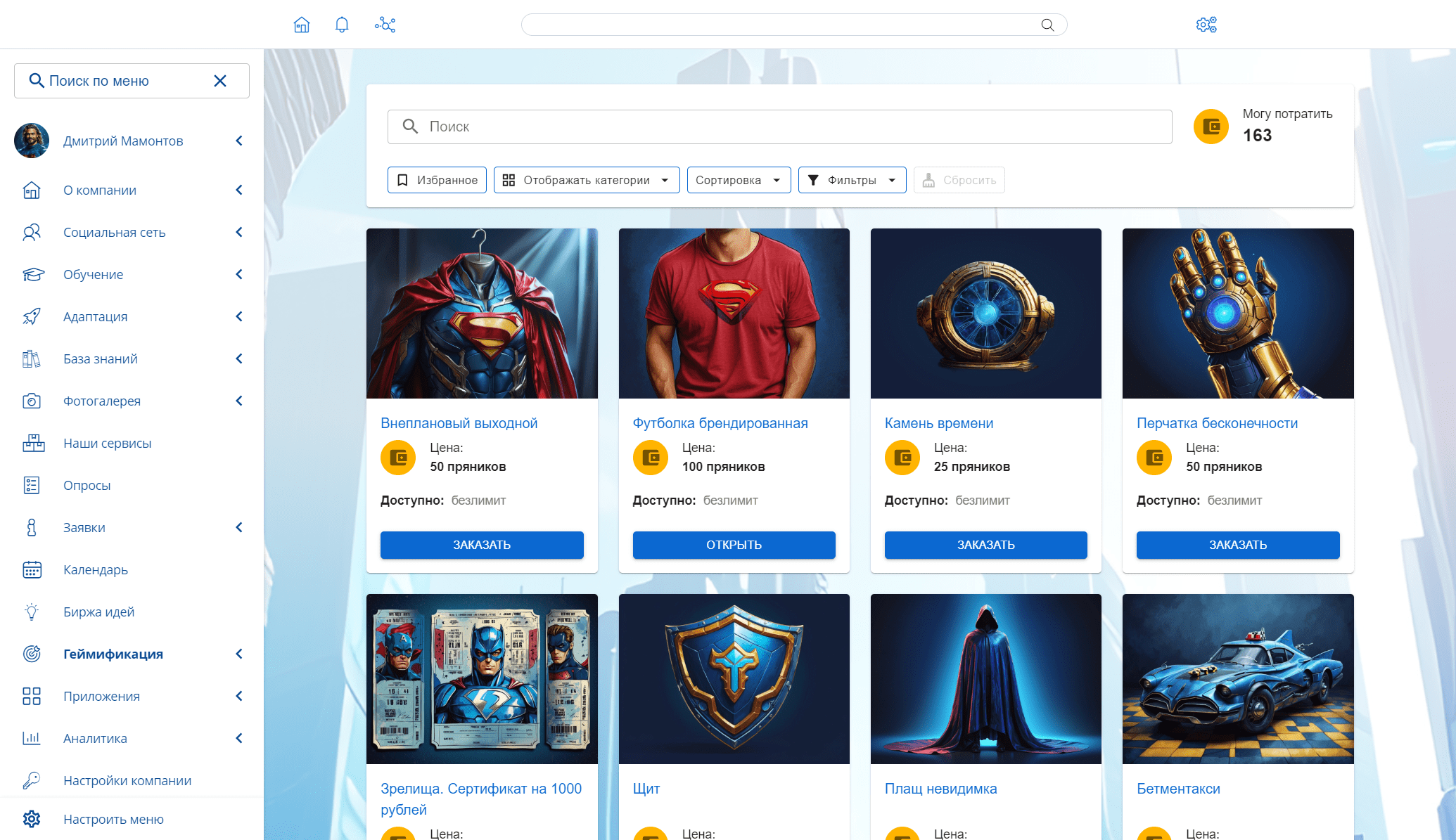 Конструктор гейммеханик: игровой валюты, бейджей, рейтингов, конкурсов, квестов, магазина призов – для различных сценариев – повышения продуктивности, командообразования, укрепления корпоративной культуры и других задач.