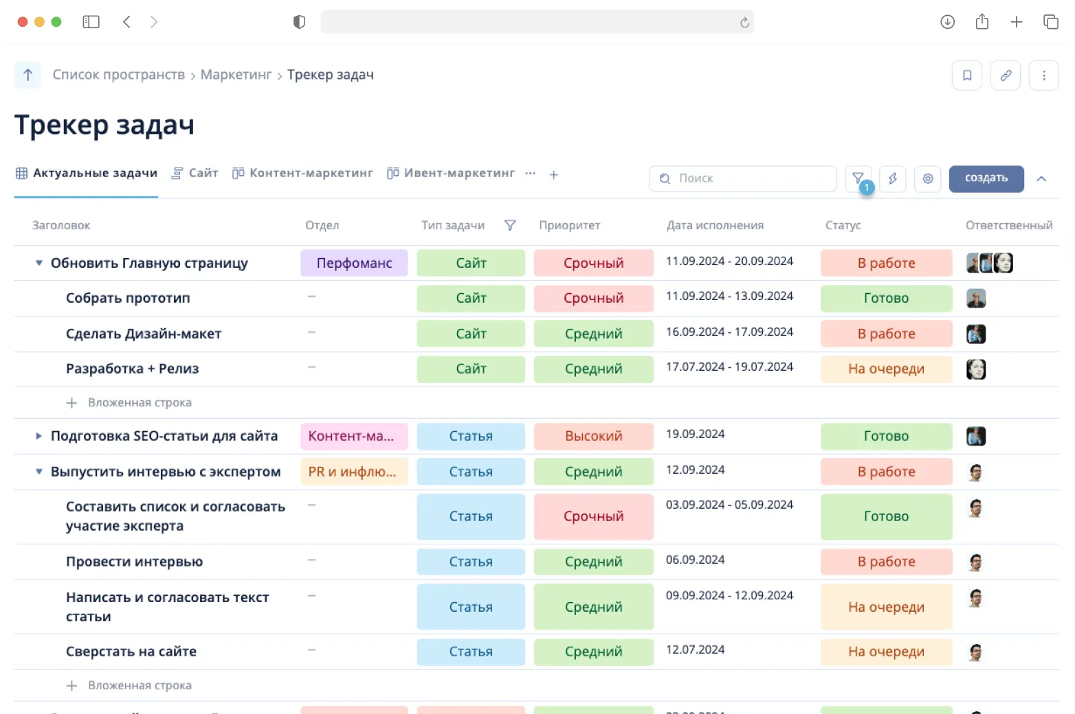 Шаблон поможет вам настроить процесс управления маркетинговыми задачами: распределять их по типам и приоритетам, назначать ответственных, следить за дедлайнами и статусами.